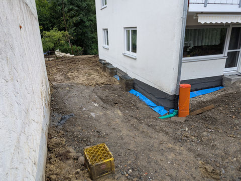 Außenabdichtung mit moderner Bitumen- oder mineralischer Beschichtung: Dazu graben wir Ihr Haus gezielt von außen frei und verbinden die Abdichtung idealerweise mit der Installation einer leistungsfähigen Drainage.